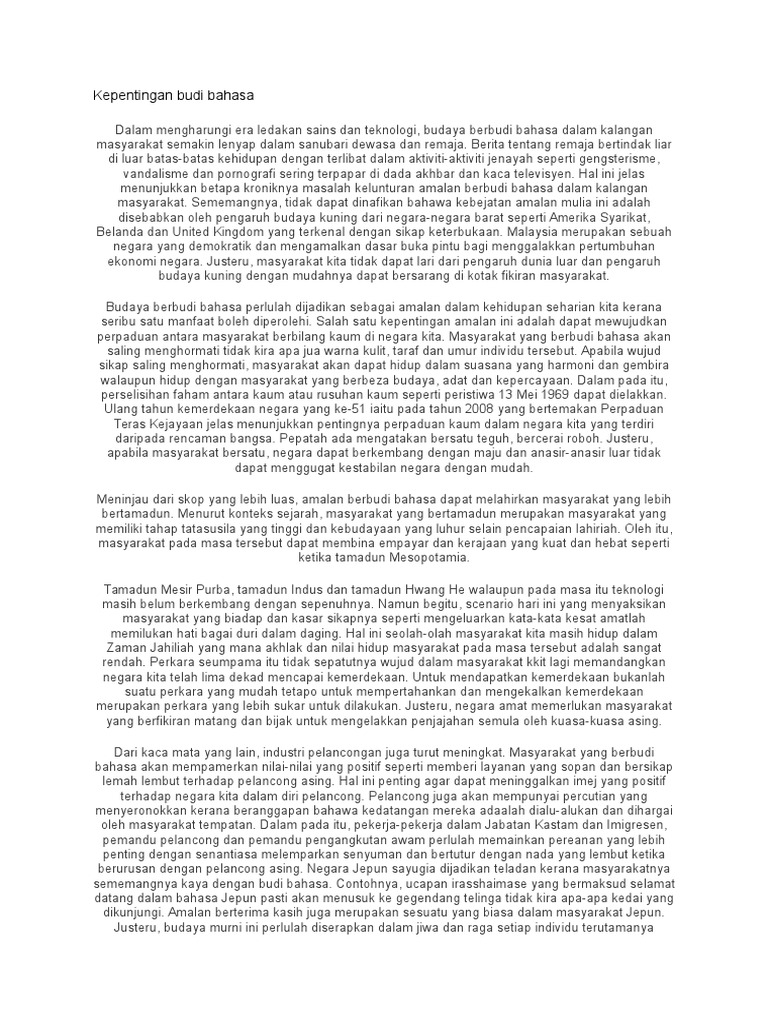 Marcapada ini,amalan budi bahasa dalam masyarakat negara kita semakin luntur. Berbudi bahasa amalan saya drag and drop. Di samping itu, kerajaan juga boleh mengadakan kempen kepentingan berbudi bahasa untuk meningkatkan nilai berbudi bahasa dalam kalangan. Melalui kajian konteks sejarah, masyarakat yang bertamadun merupakan masyarakat yang memiliki tahap tatasusila yang. Petikan pantun diatas jelas menunjukkan kepentingan berbudi bahasa dalam kalangan masyarakat.