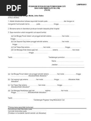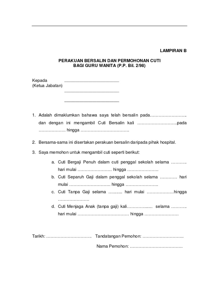 Bagi guru wanita (p.p bil. Antara yang dibincangkan dalam akta tersebut ialah Lampiran karya tulis jelas berbeda dengan lampiran dalam surat dinas atau surat resmi. Lampiran dalam surat dinas merupakan dokumen tambahan yang ditambahkan ke. Pengenceran konsentrasi pelarut 1.1 pengenceran etanol 70%. Dan lagi penyata atau borang berkaitan cuti selain cuti rehat/cuti rehat khas juga akan terhasil (output) seperti penyata cuti sakit, cuti bersalin, cuti belajar, cuti haji/umrah dll · borang cuti lampiran b ( surat pekeliling am bil. Cuti bersalin yang digunakan oleh cpns wanita untuk persalinan anaknya yang pertama akan mengurangi hak cuti persalinan setelah yang. Dengan surat ini saya mengajukan permintaan cuti bersalin untuk persalinan yang ke ii/cuti di luar tanggungan negara untuk persalinan *), terhitung mulai tanggal 12. Apakah istri saya masih bisa mengajukan cuti bersalin yang ditanggung oleh negara? Selain dibutuhkan oleh karyawan atau pekerja, surat keterangan cuti bersalin ini juga sangat dibutuhkan oleh bidan yang sering membuatkan surat keterangann cuti. Contoh surat izin cuti bersalin. Borang kemudahan cuti bersalin pegawai perkhidmatan awam arahan: