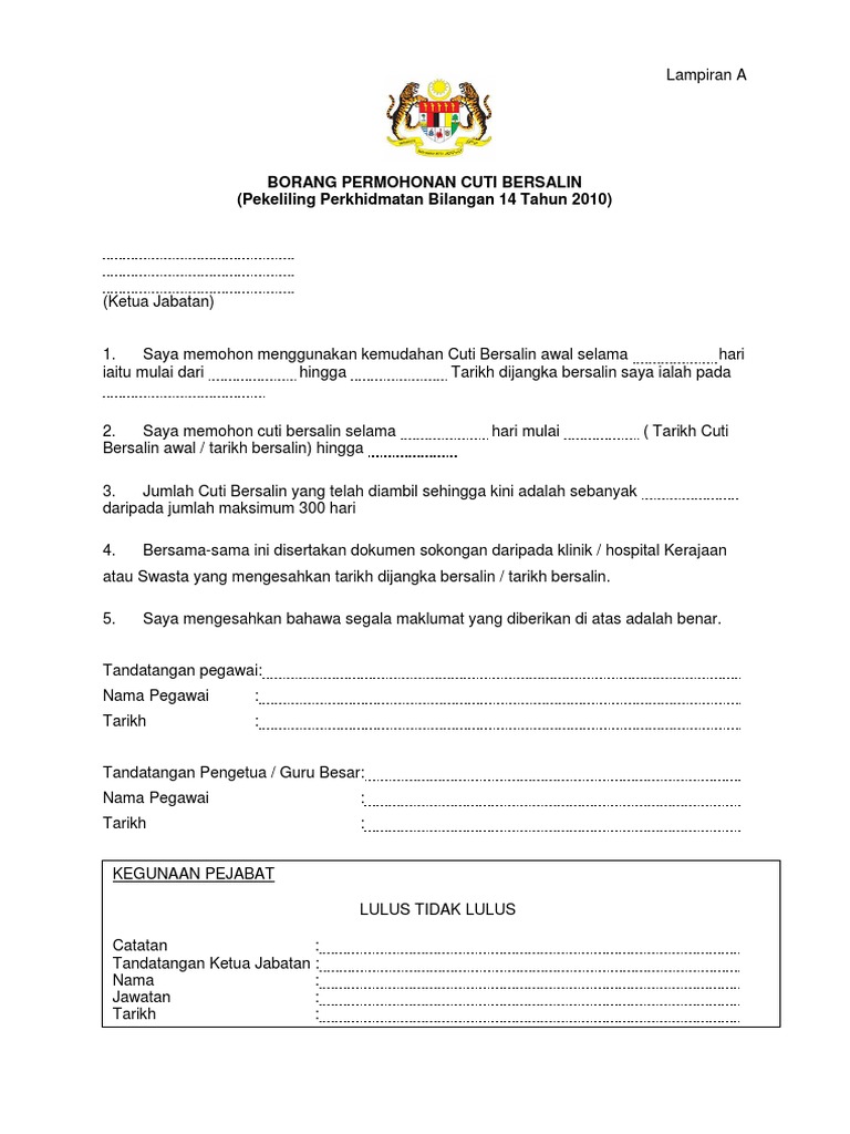 Kepada kepala dinas perhubungan komunikasi dan informatika kota makassar. Carta alir proses permohonan penajaan/cuti belajar bergaji penuh, kementerian pendidikan malaysia tahun 2019 (program ir 4.0 tahun 2019). Pegawai diberi fleksibiliti untuk menentukan tempoh cuti bersalin diantara 60 hingga 90 hari bagi setiap kelahiran. Demikianlah permintaan ini saya buat untuk dapat dipertimbangkan sebagaimana mestinya. Cuti bersalin tidak boleh bermula lebih awal daripada tempoh 30 hari sebelum bersalin (confinement) seseorang pekerja wanita.