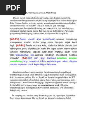 Masyarakat dilihat kurang memberi respon yang baik atau tidak berminat terhadap amalan menabung walaupun kaedah menabung masa kini. Membantu ahli keluarga yang menghadapi masalah 2.4. For more information and source, see on this link : Digunakan pada waktu kecemasan 2.2. Kerajaan telah mengambil inisiatif bagi memupuk semangat menabung dalam kalangan pengguna. Untuk menyemai amalan yang murni ini dalam kalangan masyarakat, syarikat insurans telah menggalakkan masyarakat supaya menabung dengan cara menawarkan skim tabungan yang pelbagai untuk kecemasan, iaitu kad perubatan. Mengamalkan sikap berjimat cermat 2.3. Amalan menabung merupakan satu langkah berjimat cermat untuk masa depan. Pengenalan kumpulan wang simpanan pekerja (kwsp) ialah contoh kesungguhan kerajaan untuk menyedarkan masyarakat akan pentingnya perancangan masa depan kerana kita perlu meny ediakan payung sebelum hujan. Namun begitu, dalam era pascaglobalisasi ini kesedaran untuk menabung semakin menyusut dalam kalangan masyarakat kita khususnya bagi golongan remaja. Hal ini kerana kehidupan rakyat malaysia dilihat kian terbeban dengan kos hidup yang meningkat. Kebaikan amalan menabung dalam kalangan masyarakat bahagian a. Terbuktilah bahawa, kebaikan amalan menabung dalam kalangan masyarakat ialah dapat membantu keluarga yang ditimpa kesusahan (91 patah perkataan) isu :
